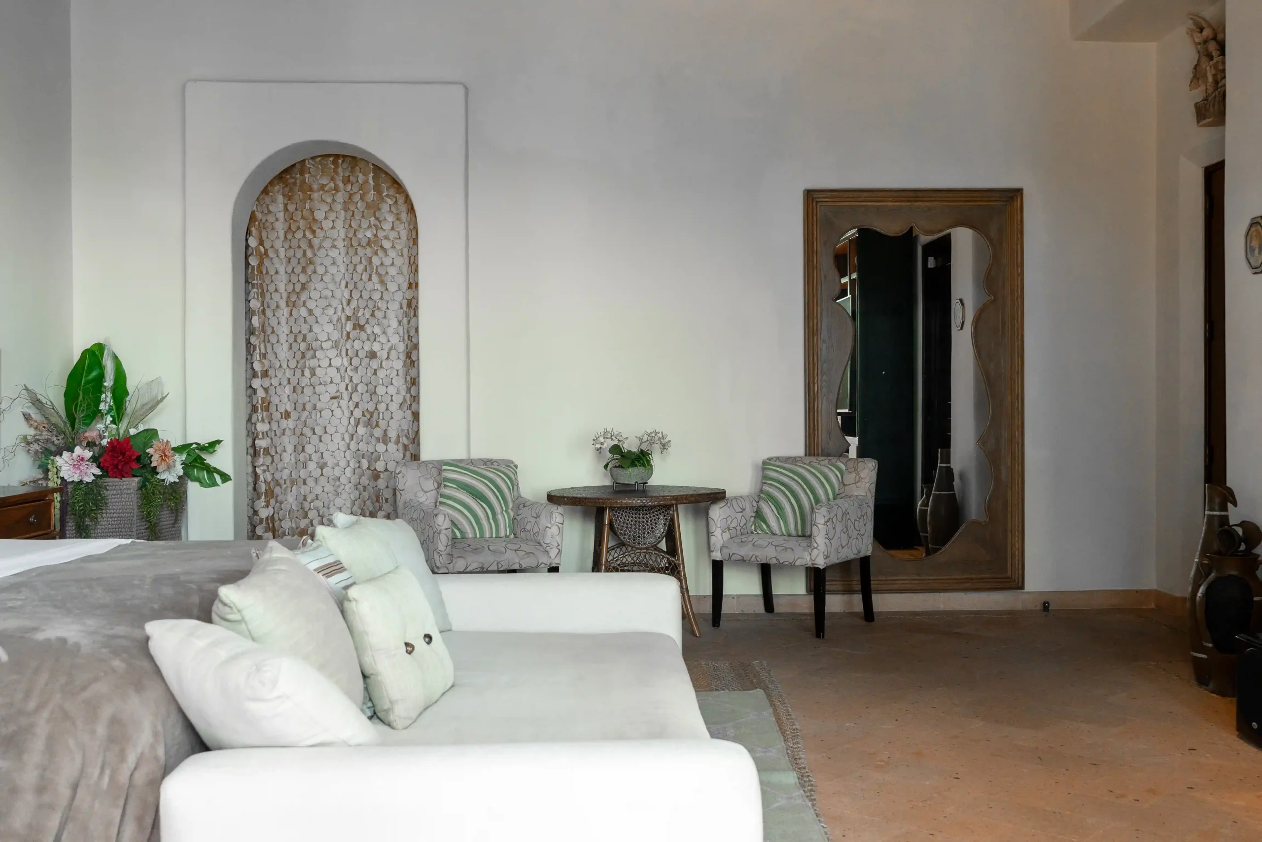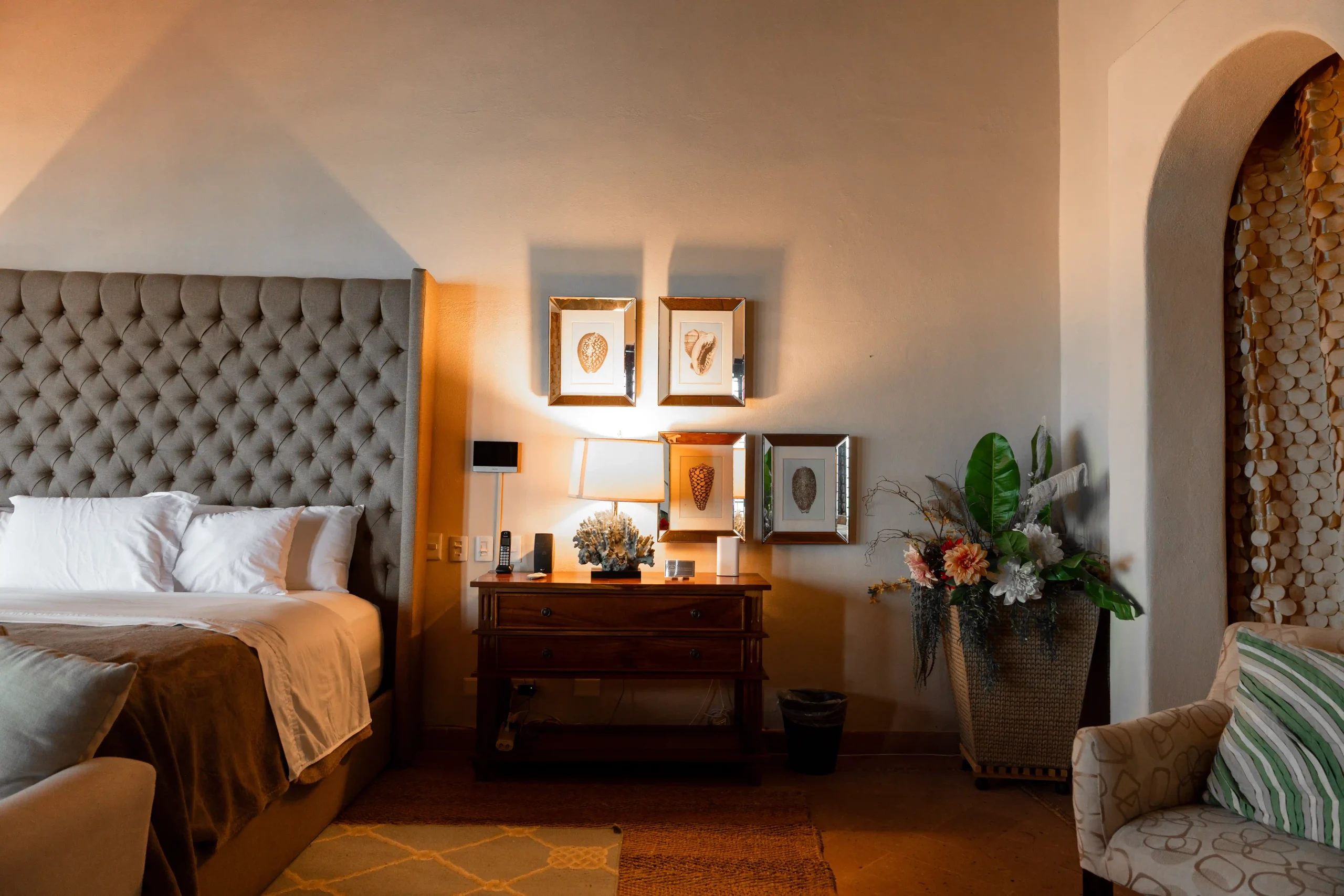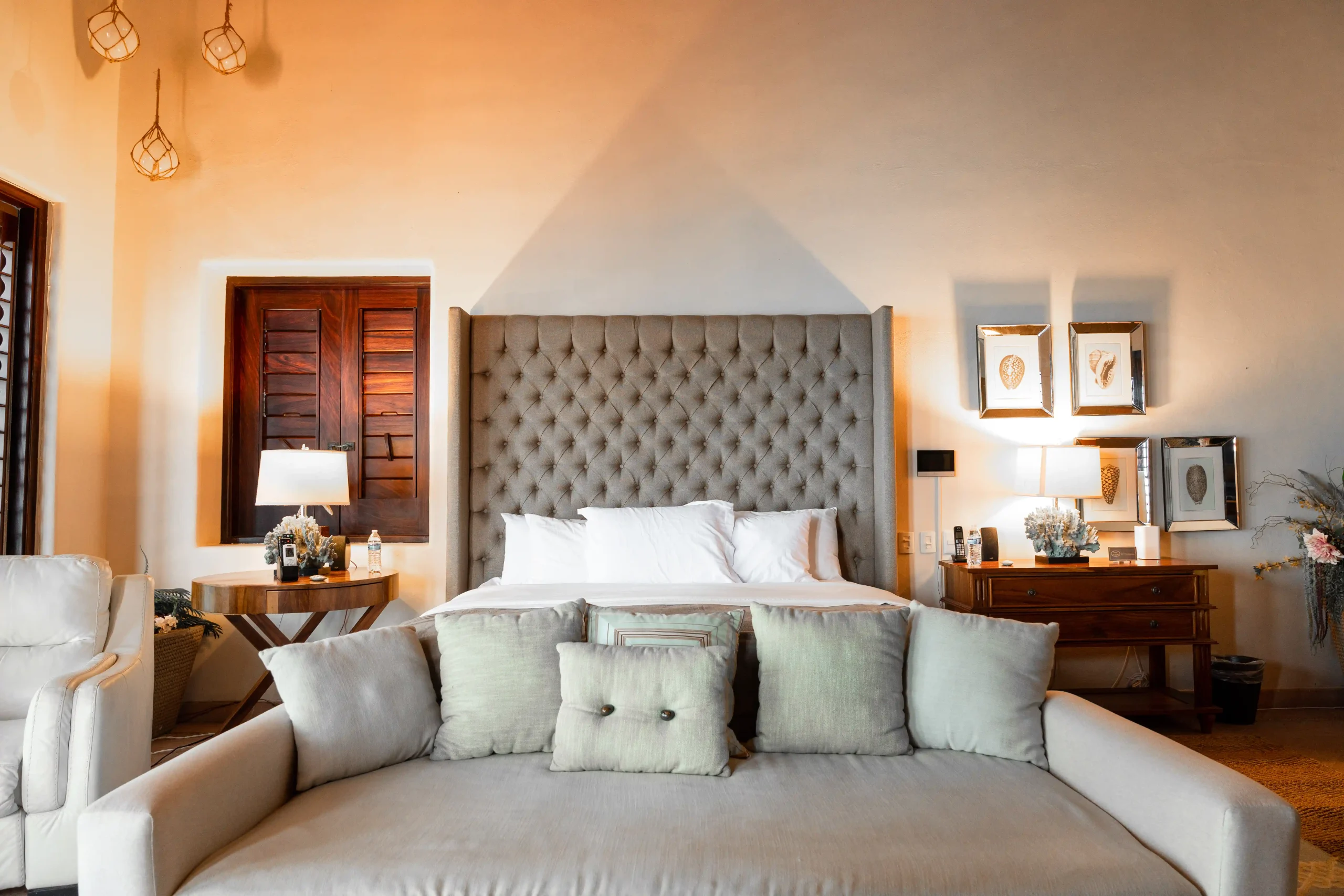 With soaring double-height ceilings and uninterrupted ocean views, the Master Suite is the crown jewel of Casa Contenta. Featuring a plush king-size bed, a private bathroom with two separate vanities for added privacy, and a luxurious soaking tub, this retreat was designed for comfort and serenity. Step onto your private balcony and let the sea become part of your stay — a perfect blend of elegance, space, and tranquility.