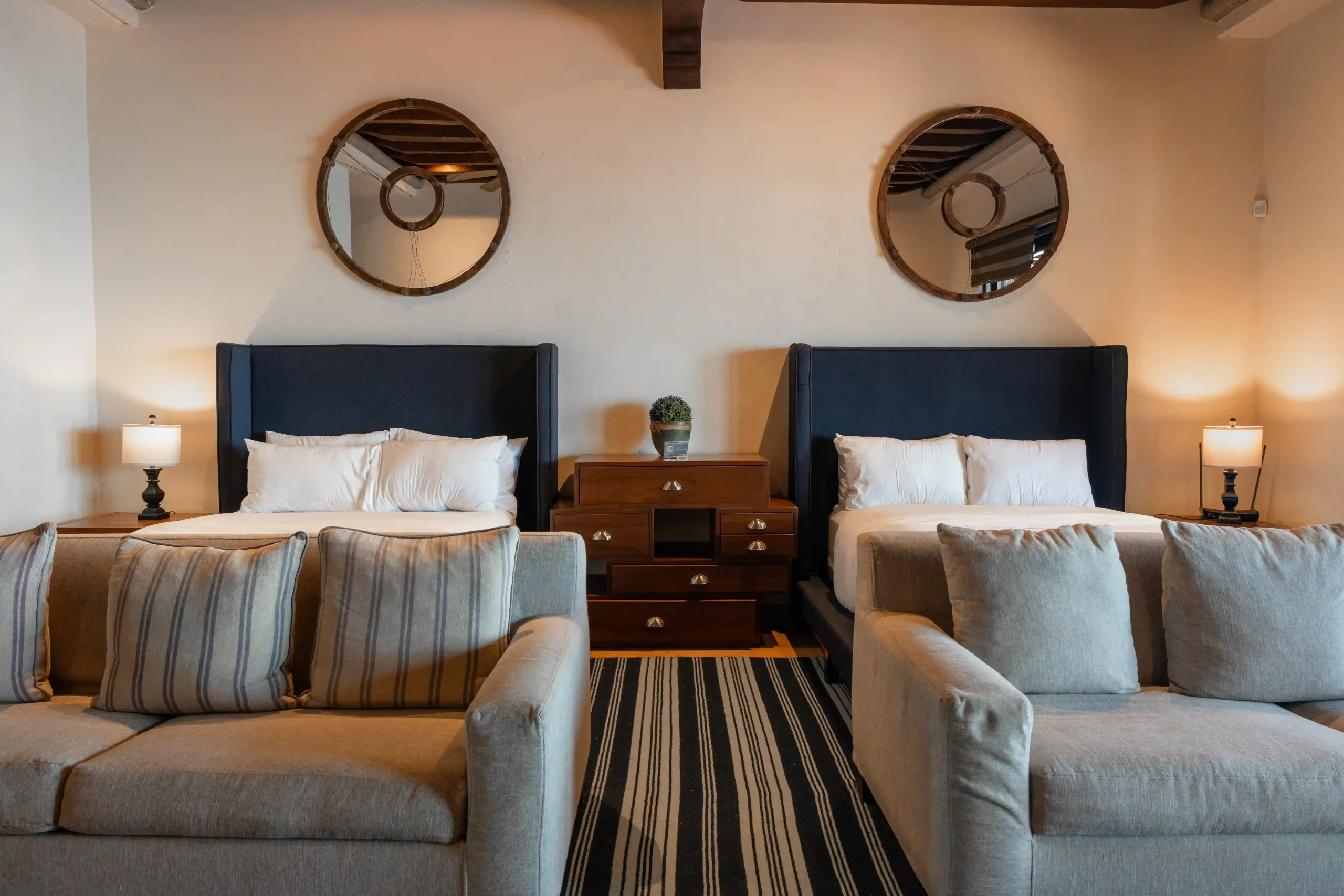 Steps from the pool and framed by serene ocean views, this suite offers a perfect balance of comfort and elegance. Two double beds with premium linens create a restful escape, while a private bathroom adds ease and privacy. Its seamless connection to the pool terrace makes it an inviting retreat where relaxation flows effortlessly.
