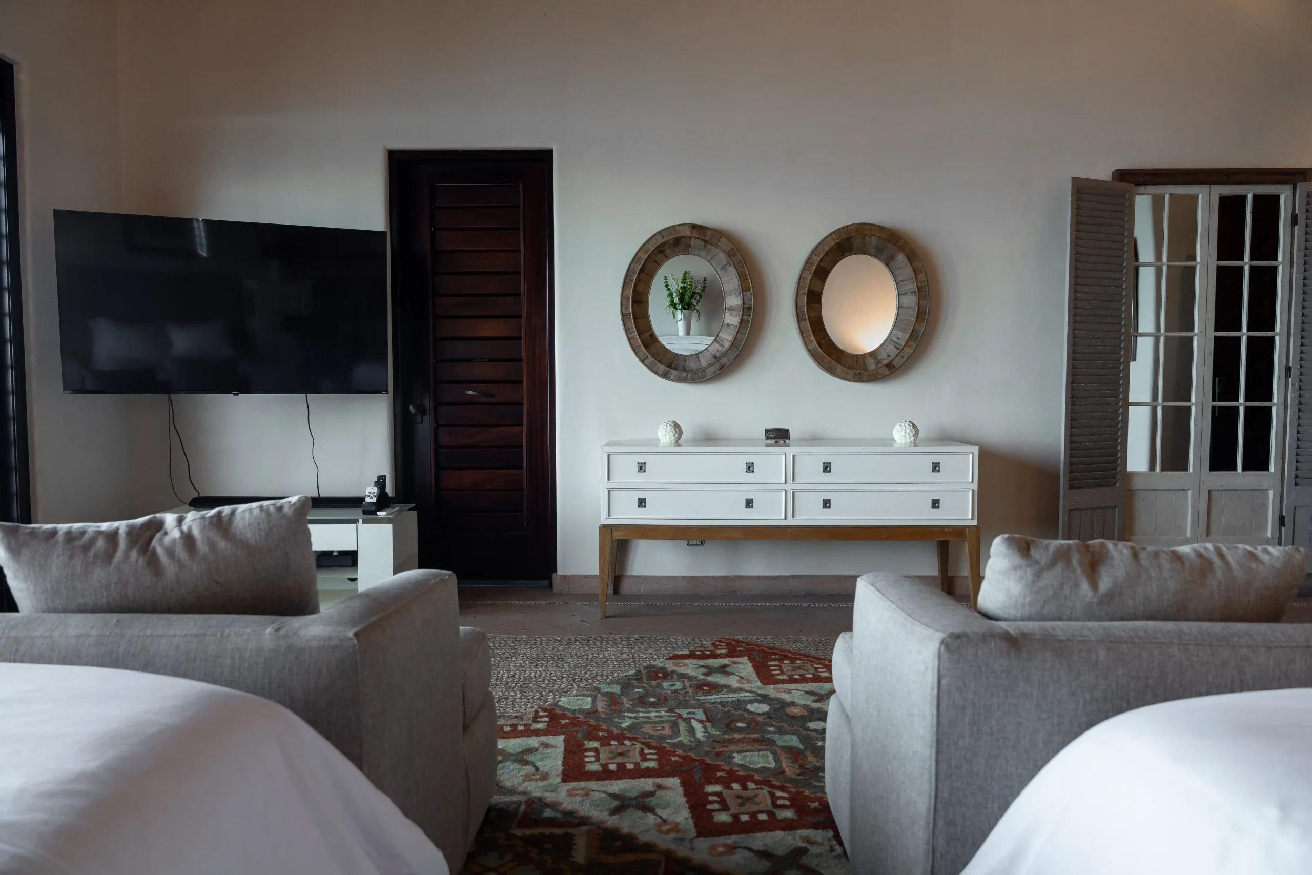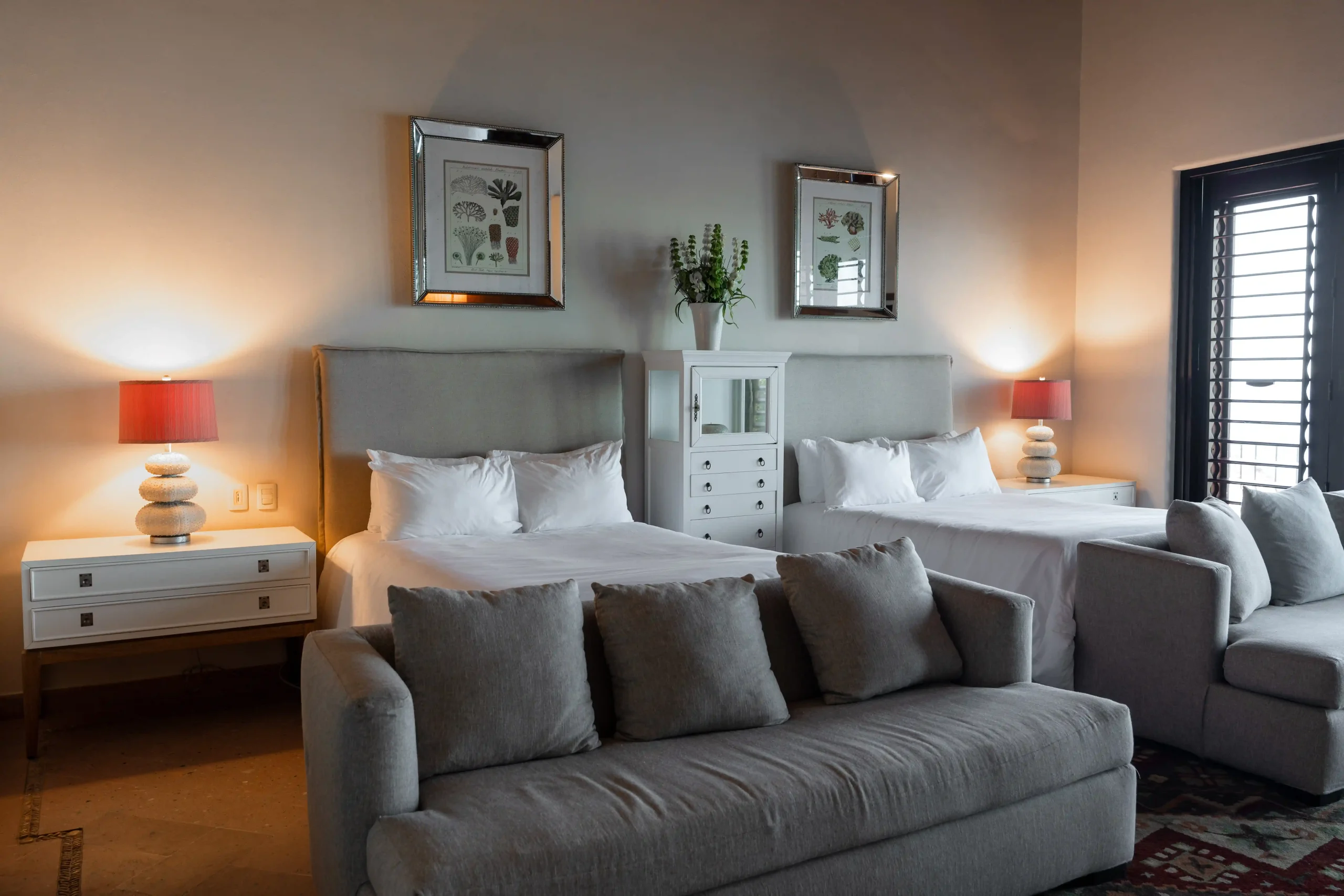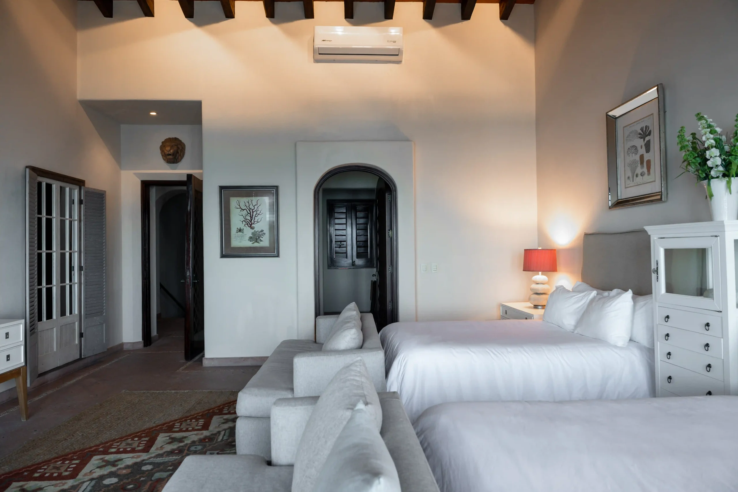 With soaring double-height ceilings and serene ocean views, this suite offers a spacious retreat within Casa Contenta. Two double beds dressed in premium linens provide comfort and elegance, while a private bathroom ensures ease and privacy. Bathed in natural light and the gentle rhythm of the sea, it’s a sanctuary designed for restful moments.